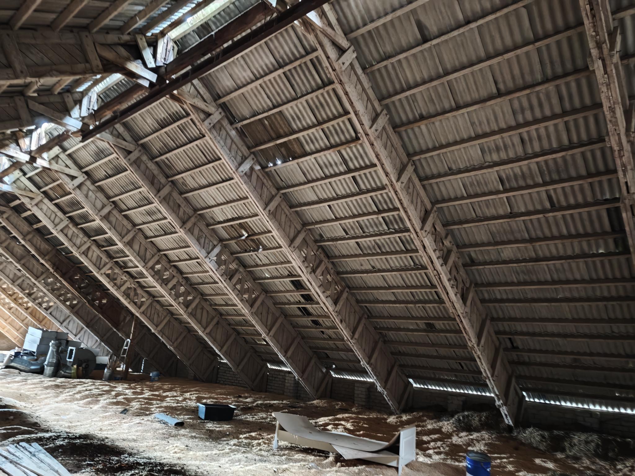 Katuse kattematerjali uuendamine. Uus kattematerjal kas eterniit või plekk, sõltub sellest, mida töö tegija soovitab. Katuse pinda ca 1200 m2. Katuseharja pikkus ca 53 m, harja kõrgus maapinnast ca 12 m. Katuse kalle ca 33 kraadi. Katuse külje pikkus ca 11 m. Fermide vahe 3 meetrit, olemasoleva roovi mõõt 60 x 100 mm. Fermid on kohati ära vajunud, roovid valdavalt läbi paindunud, lohku vajunud. Hoone asub Tartumaal, Soosilla külas. Postiindeks 61710